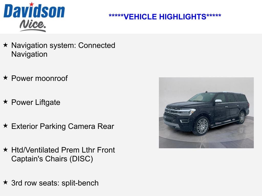 At Davidson Ford, we are committed to providing an exceptional purchasing and ownership experience. Our knowledgeable sales team is dedicated to finding the perfect vehicle to meet your needs and budget. We invite you to schedule a test drive and experience the remarkable capabilities of this Expedition Max Platinum for yourself.