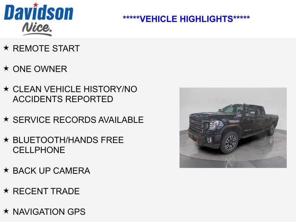 REMOTE START, ONE OWNER, CLEAN VEHICLE HISTORY/NO ACCIDENTS REPORTED, SERVICE RECORDS AVAILABLE, Bluetooth®/HANDS FREE CELLPHONE, BACK UP CAMERA, RECENT TRADE, NAVIGATION GPS, REMAINDER OF FACTORY WARRANTY, FRESH OIL CHANGE, FULLY DETAILED, 4X4, 10-Speed Automatic, 4WD, Jet Black With Kalahari Accents Leather, 12-Volt Rear Auxiliary Power Outlet, 120-Volt Bed Mounted Power Outlet, 120-Volt Instrument Panel Power Outlet, 2 USB Ports, 2 USB Ports (1st Row), 2-Speed Active Transfer Case, 2nd Row Dual USB Charge-Only Ports, 4.2 Diagonal Color Display Driver Info Center, Compass Located In Instrument Cluster, Deep-Tinted Glass, Driver Alert Package I, Electric Rear-Window Defogger, Electrical Lock Control Steering Column, Floor-Mounted Center Console, Front Prem Floor Liners w/Removable Carpet Insert, HD Rear Vision Camera, Heated & Ventilated Front Bucket Seats, Heated 2nd Row Outboard Seats, Heated Driver & Front Outboard Passenger Seats, Heated front seats, Heated rear seats, Heated steering wheel, Integrated Trailer Brake Controller, Keyless Open & Start, Lane Change Alert w/Side Blind Zone Alert, LED Cargo Area Lighting, Manual Tilt-Wheel/Telescoping Steering Column, Navigation System, OnStar & GMC Connected Services Capable, Painted Black Surround Grille, Perimeter Lighting, Power Door Locks, Power driver seat, Power Front Passenger Windows w/Express Up/Down, Power Rear Windows w/Express Down, Power Sunroof, Power Windows w/Driver Express Up/Down, Preferred Equipment Group 4SB, Premium audio system: Premium GMC Infotainment System, Rear Cross Traffic Alert, Rear Prem Floor Liners w/Removable Carpet Insert, Rear Wheelhouse Liners, Red Recovery Hooks, Remote Vehicle Starter System, Spray-On Pickup Box Bed Liner w/AT4 Logo, Steering Wheel Audio Controls, Ultrasonic Front & Rear Park Assist, Unauthorized Entry Theft-Deterrent System, Ventilated front seats, Wireless Phone Projection, X31 Off-Road Package. 2023 GMC Sierra 2500HD AT4 4WD Odometer is 20209 miles below market average! Onyx Black 10-Speed Automatic Duramax 6.6L V8 Turbodiesel