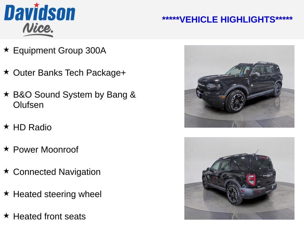 This 2025 Ford Bronco Sport Outer Banks is a certified pre-owned vehicle, meaning it has been thoroughly inspected and comes with a comprehensive warranty. You can trust that this SUV has been well-maintained and is ready to provide you with years of reliable service.